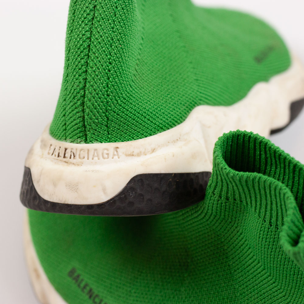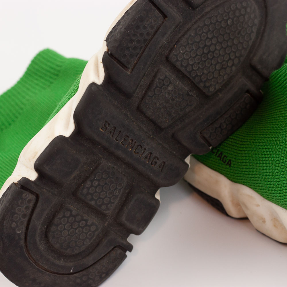 Balenciaga Schuhe (Speed Trainer) in grün zum Reinschlüpfen, weiße Sohle, Größe 25-26. Hinweis: weiße Sohle deutliche Flecken/Verfärbungen, Stoffqualität befriedigend.