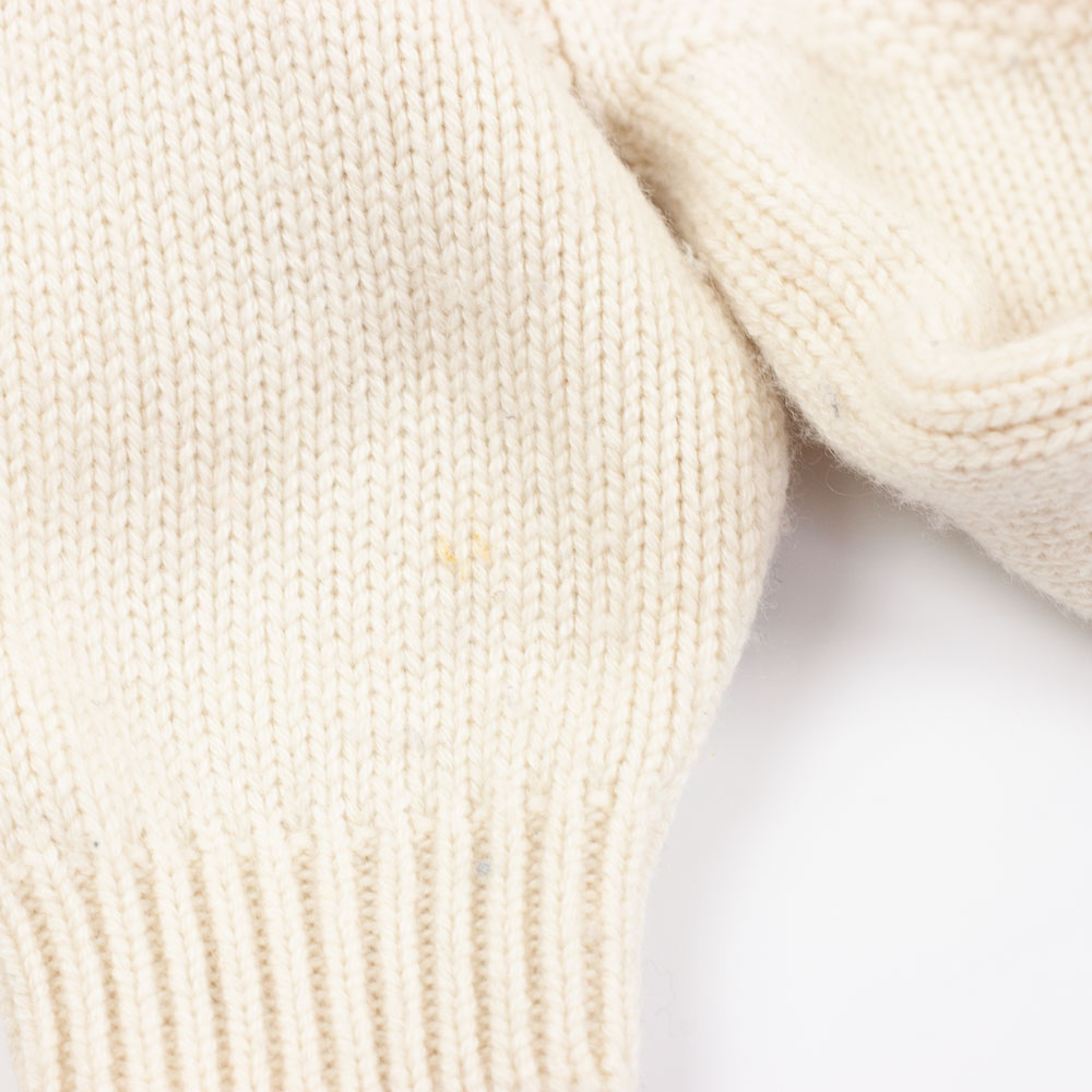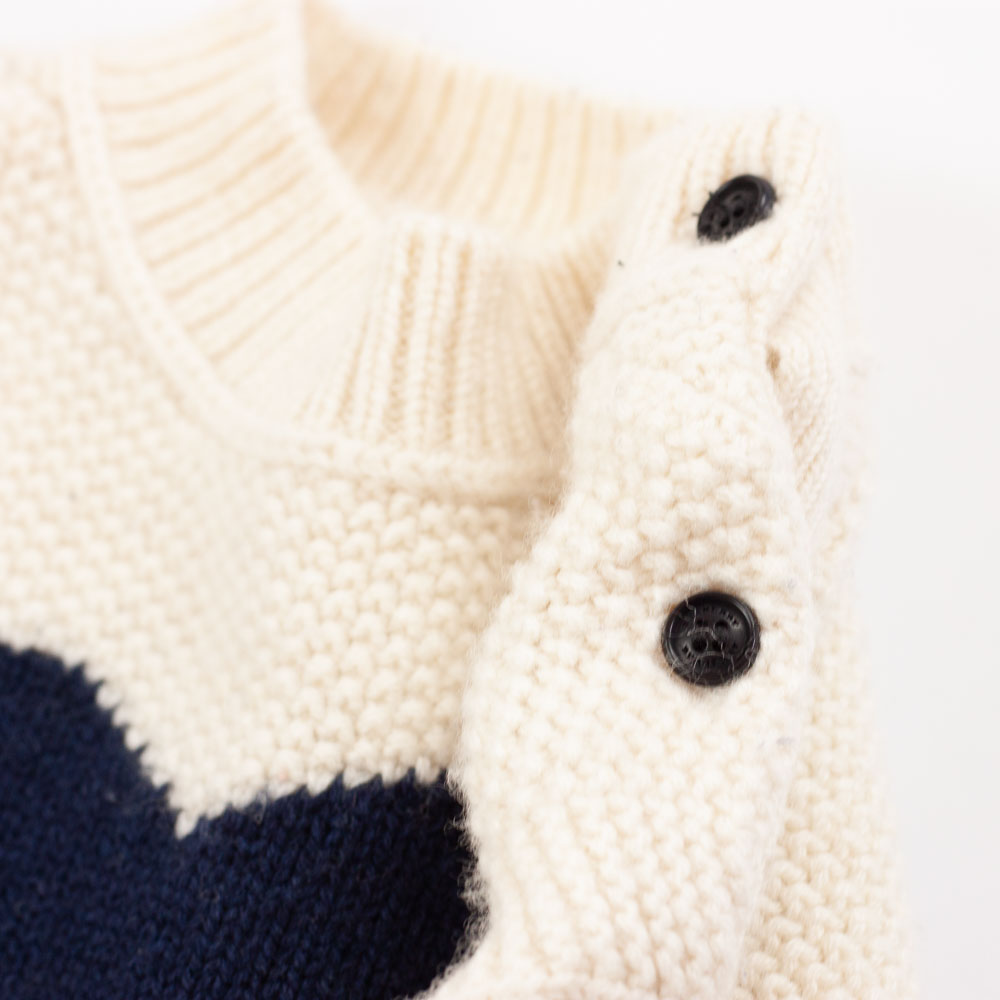 Burberry Pullover aus Wolle mit Kaschmiranteil (7%), seitliche Knöpfe am Hals, Creme/off-white mit blauem Herz. Hinweis: leichtes Pilling, vereinzelt unauffällige Flecken.