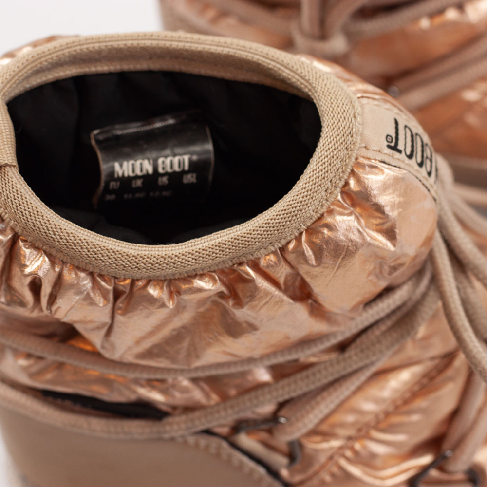 Moon Boot Schneeschuh in gold / rosé mit Schnürung. Hinweis: Schäden am Obermaterial, sichtbare Gebrauchsspuren.